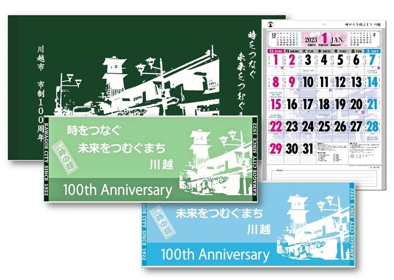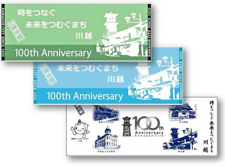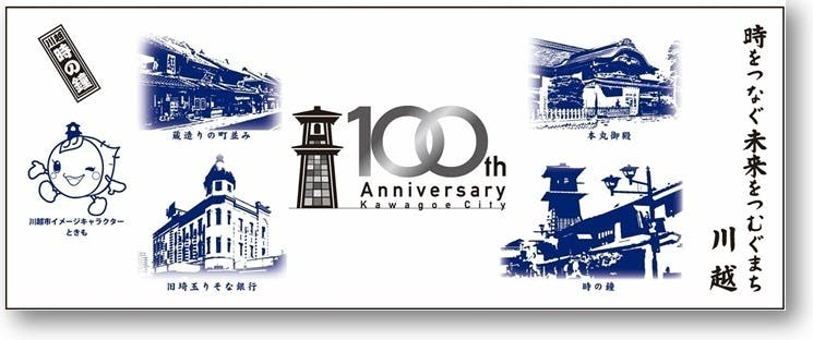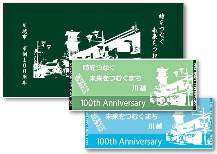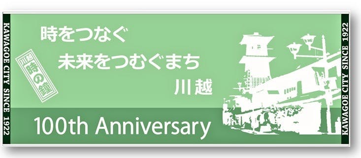 川越の象徴〝時の鐘〟と川越市100周年のキャッチフレーズをバランスよく配置。100周年記念にふさわしいデザインとなっています。色は淡い緑基調と淡い水色基調の2色をご用意いたします。