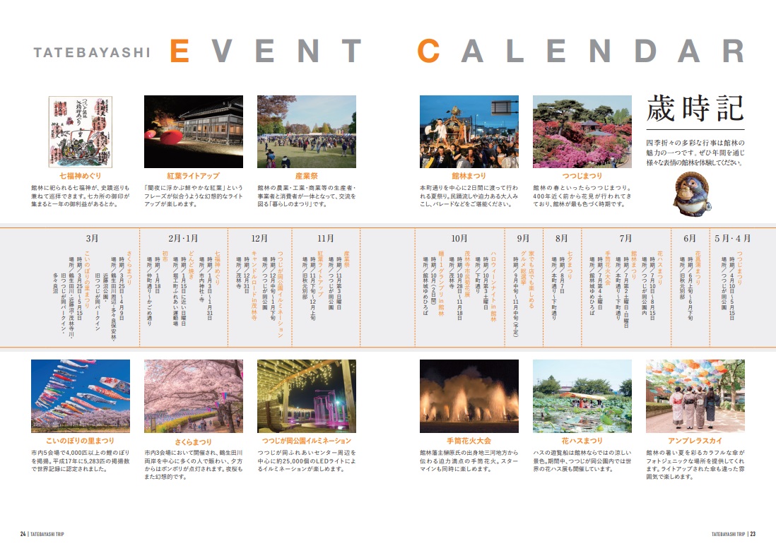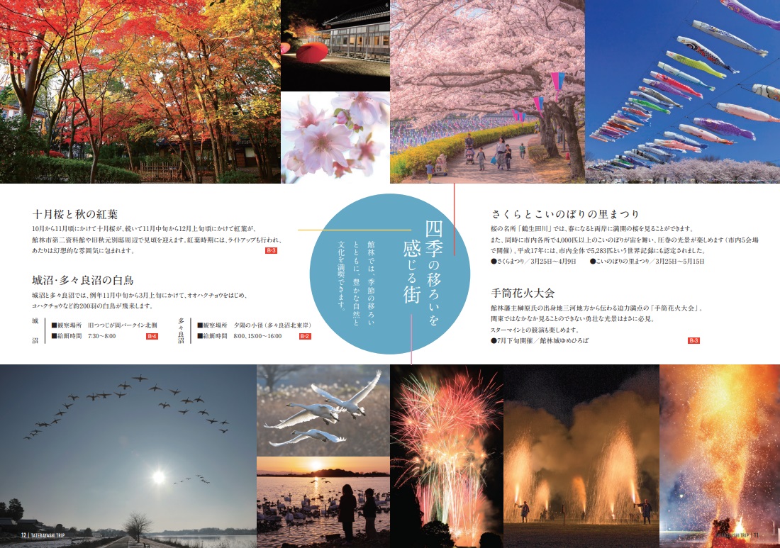 さくらまつり 期 間:毎年3月25日~4月9日 場 所:➀鶴生田川両岸~尾曳稲荷神社 ➁多々良保安林 ➂近藤沼公園 ➃つつじが岡パークイン 概 要:市内4会場において開催され、夕方からはボンボンが点灯され、夜桜もまた幻想的です。 こいのぼりの里まつり 期 間:毎年3月25日~5月15日 場 所:鶴生田川・近藤沼・茂林寺川・旧つつじが岡パークイン・多々良沼 概 要:市内5か所に約4,000匹のこいのぼりが春風に吹かれて水面を揺らし壮観に泳ぎます。