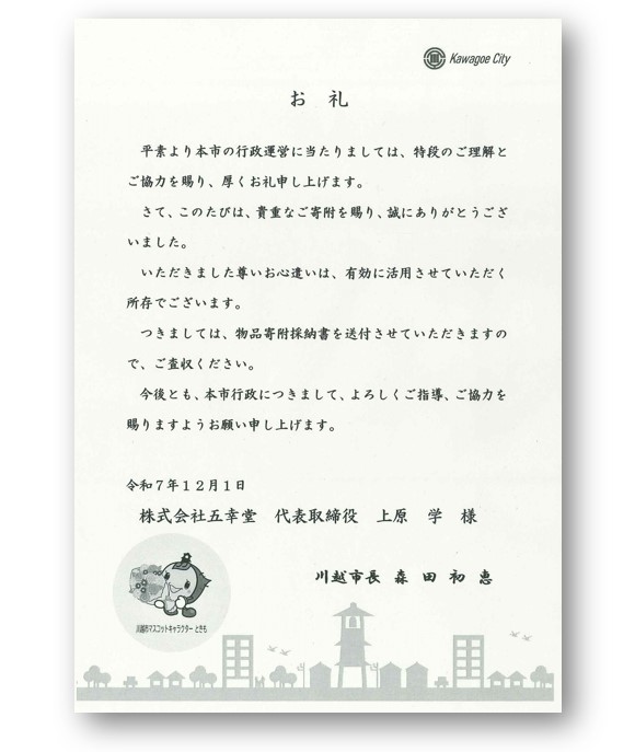 五幸堂では毎年12月、販売終了後の川越カレンダー余剰分を川越市政策企画課を通じ川越市へ寄付させていただいています。