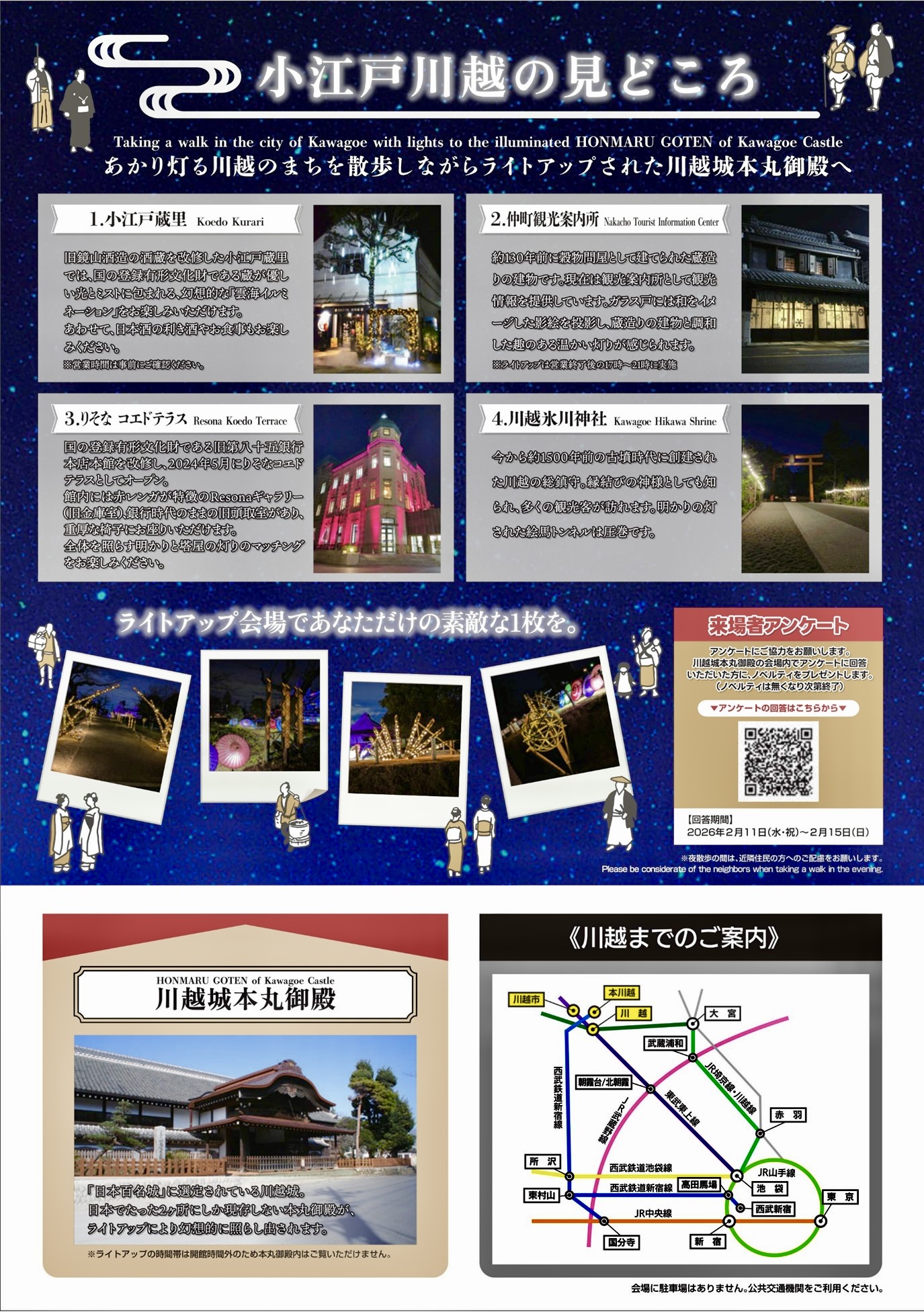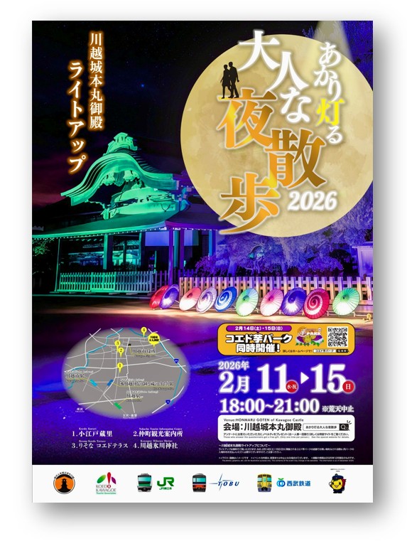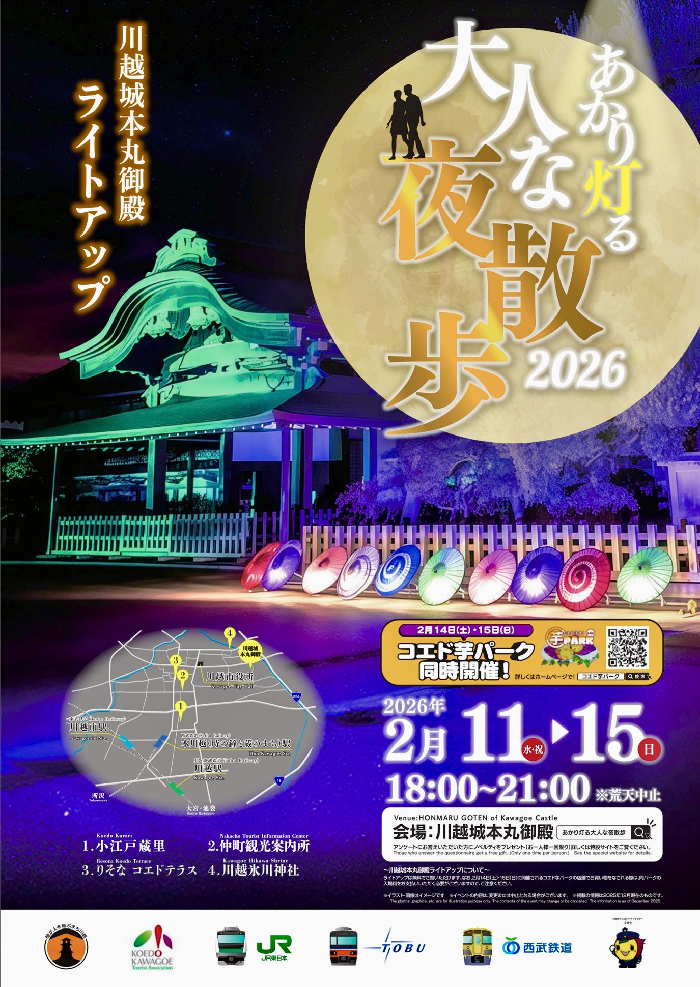 あかり灯る大人な夜散歩2026 【開催日時】 令和8年2月11日(水・祝)~15日(日)の18時~21時 【会場】 川越本丸御殿周辺 【アクセス】 ★電車の場合 東武東上線・JR川越線「川越駅」、西武新宿線「本川越駅」下車、東武バス「札の辻」より徒歩約10分 ★お車の場合 関越自動車道「川越IC」より約15分 【問い合わせ】 小江戸川越観光協会(049-227-9496) 引用元:川越市公式HP