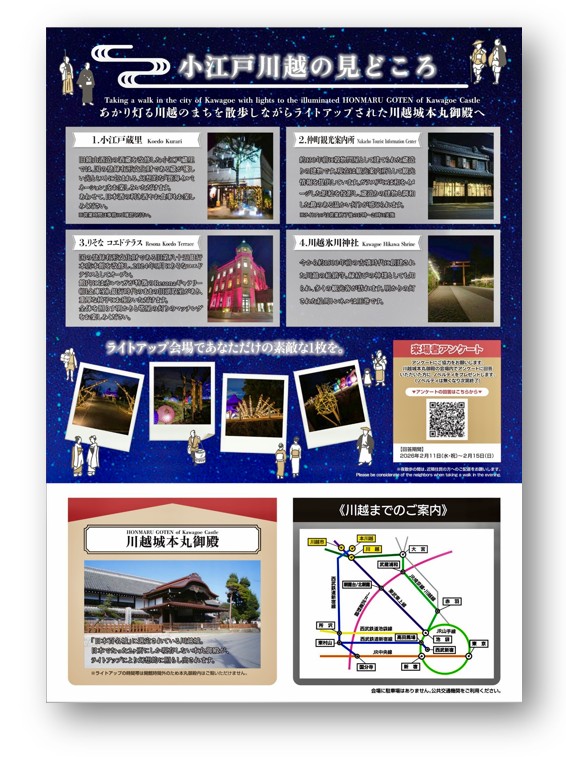 「川越城本丸御殿」に加え、小江戸蔵里、仲町観光案内所、りそなコエドテラス、川越氷川神社においてもライトアップを同日開催。