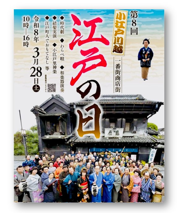 2026年3月2日 / 最終更新日 : 2026年3月2日 五幸堂 川越(カワゴエノコト) 小江戸川越 江戸の日 今年も川越一番街にて小江戸川越「江戸の日」が開催されます。 3月28日(土)は商店街の皆様が江戸町人姿となってお客様をおもてなし。 歩行者天国になる蔵造りの町並みで様々なイベントが行われます。 春は川越に大集合です!タイムスリップした春の小江戸で食べ歩きや散策を楽しみましょう。 TEL:049-293-4022 FAX:049-293-4023e-mail:gokodo-kawagoe@g.email.ne.jp Follow me! FacebooktwitterHatenaPocketCopy
